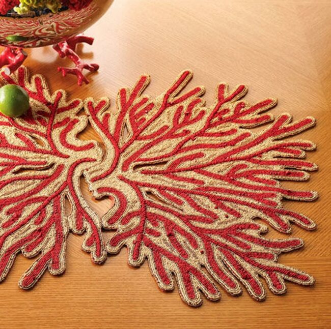 Natural wood warmth radiates from this dining table where a unique red coral-patterned mat creates a beachy vibe against the smooth surface.