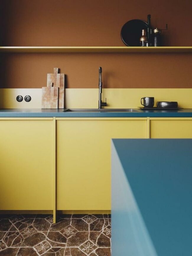 Cheerful yellow cabinets dance beneath a cool blue countertop, creating an unexpected color harmony.