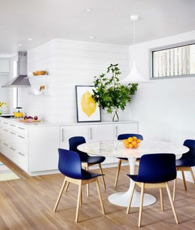 White and blue color palettes blend seamlessly throughout the space, creating visual harmony.
