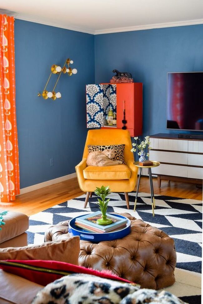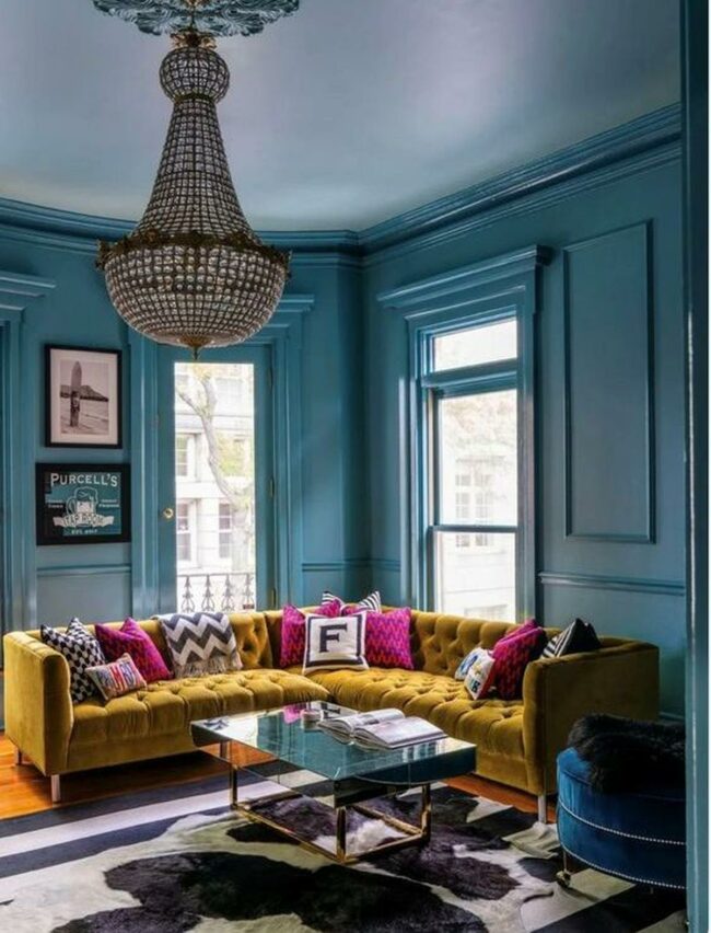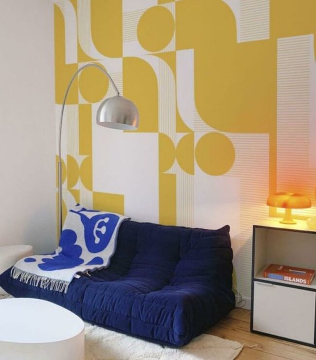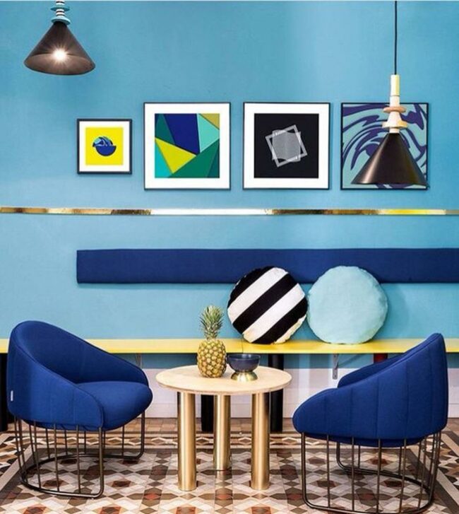 Cool blue tones and warm yellow accents dance around the room, making the space feel simultaneously energetic and relaxed.
