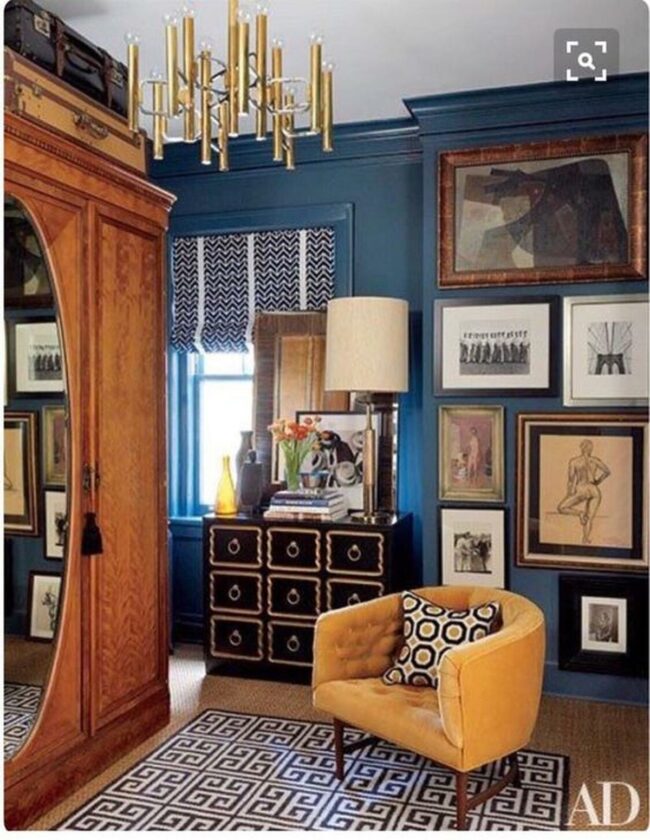 Blue walls are the dramatic backdrop that showcases stunning artwork in this inviting room.
