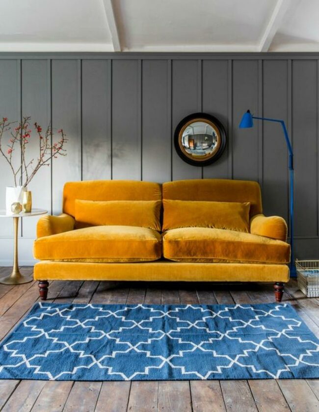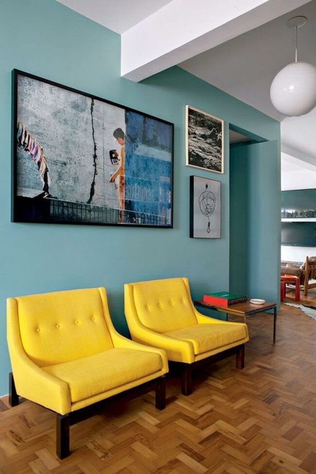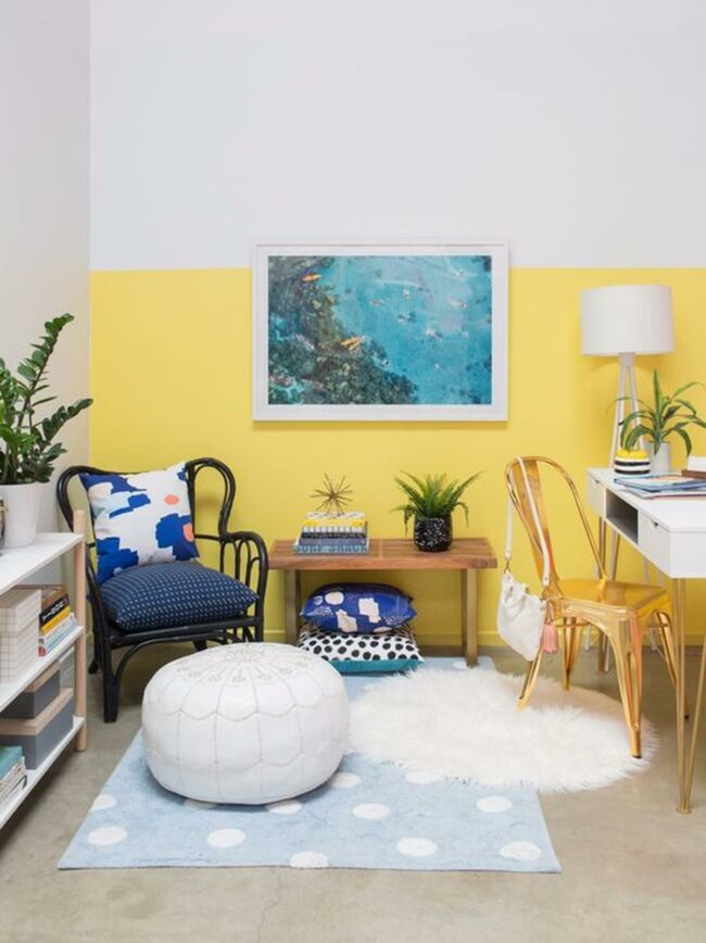 The sunny warmth of yellow perfectly complements cool blue tones, establishing balance while making spaces appear larger and more inviting.