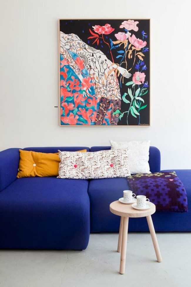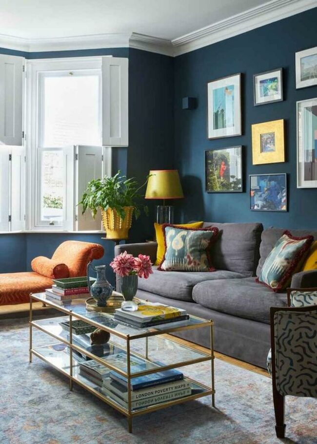 Deep blue walls provide a dramatic backdrop for colorful artwork hanging above a sleek gray sofa.