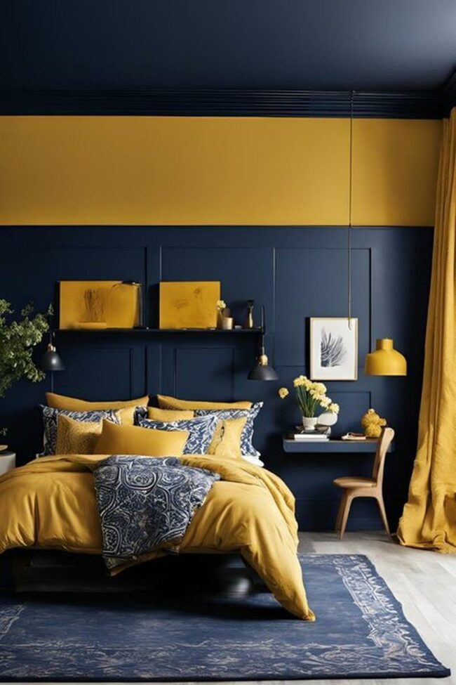 Navy and mustard bedroom designs are bold color statements that energize personal spaces.