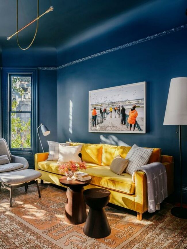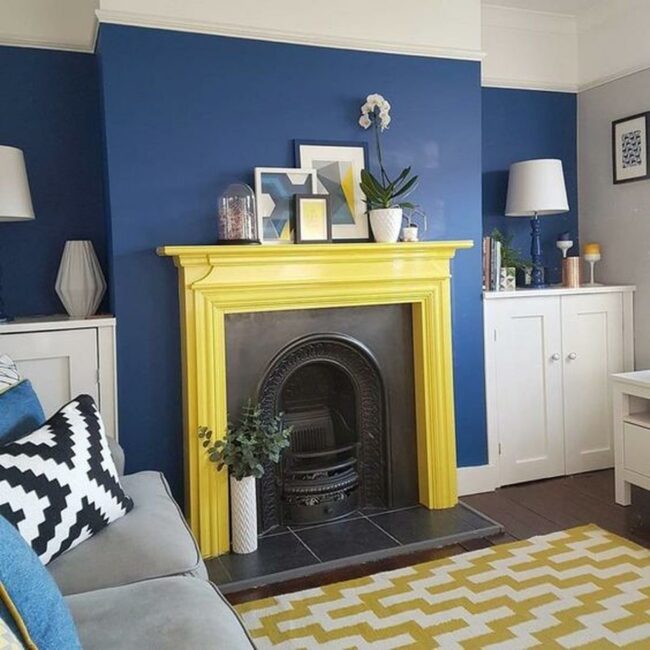 Yellow fireplace is the dazzling focal point of this stunning living room, commanding attention with its bold hue against deep blue walls.