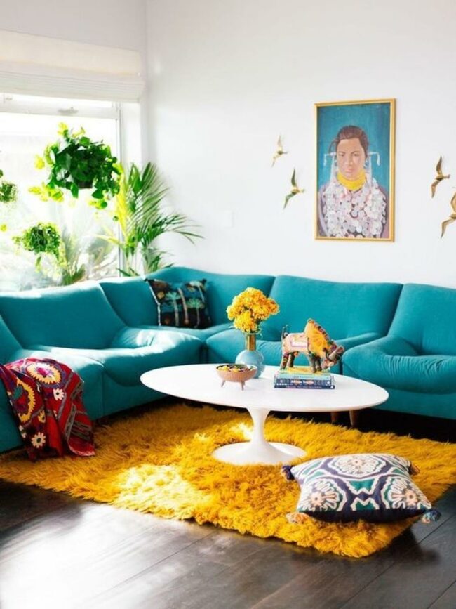 Teal sofa is the stunning centerpiece of this inviting living space, commanding attention with its bold color and corner-wrapping design.