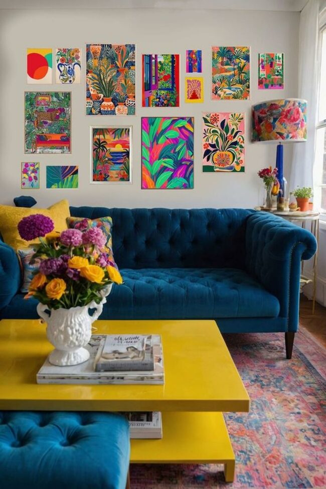 Colorful framed artwork brings personality to blank wall spaces, telling visual stories through color and composition.