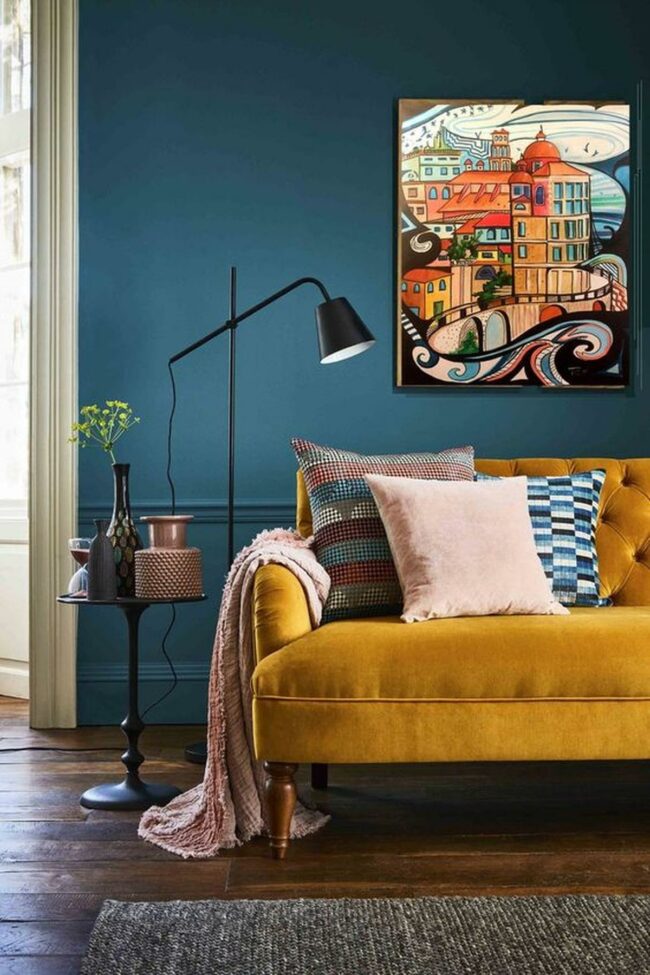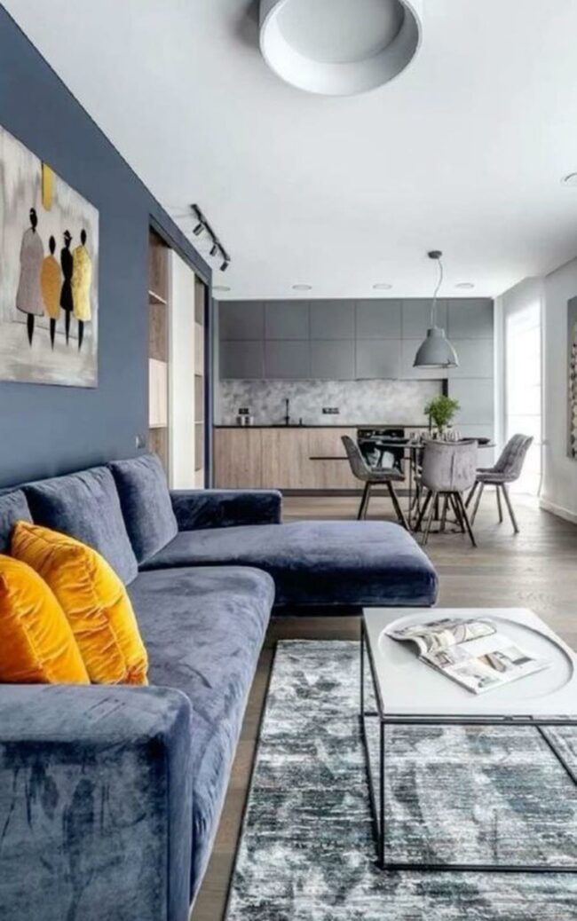 Blue sofa is the eye-catching centerpiece of this modern living space, commanding attention with its deep tone and vibrant yellow accent pillows.