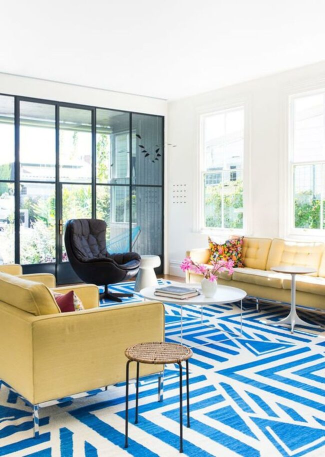 Bold blue-and-white rugs with zigzag patterns add dynamic visual interest to the floor's landscape.