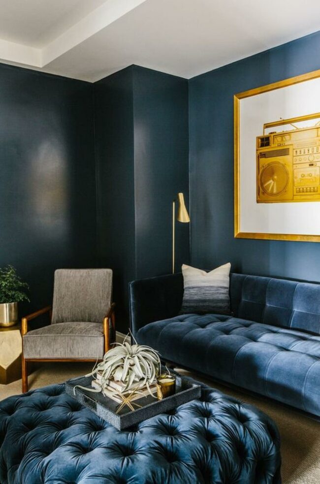 Blue walls anchor this living room with rich, serene depth that immediately draws you in.