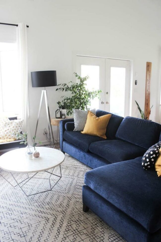 Deep blue sectional sofas anchor the room with bold color and comfort, complemented by mustard yellow and patterned pillows that add visual interest.