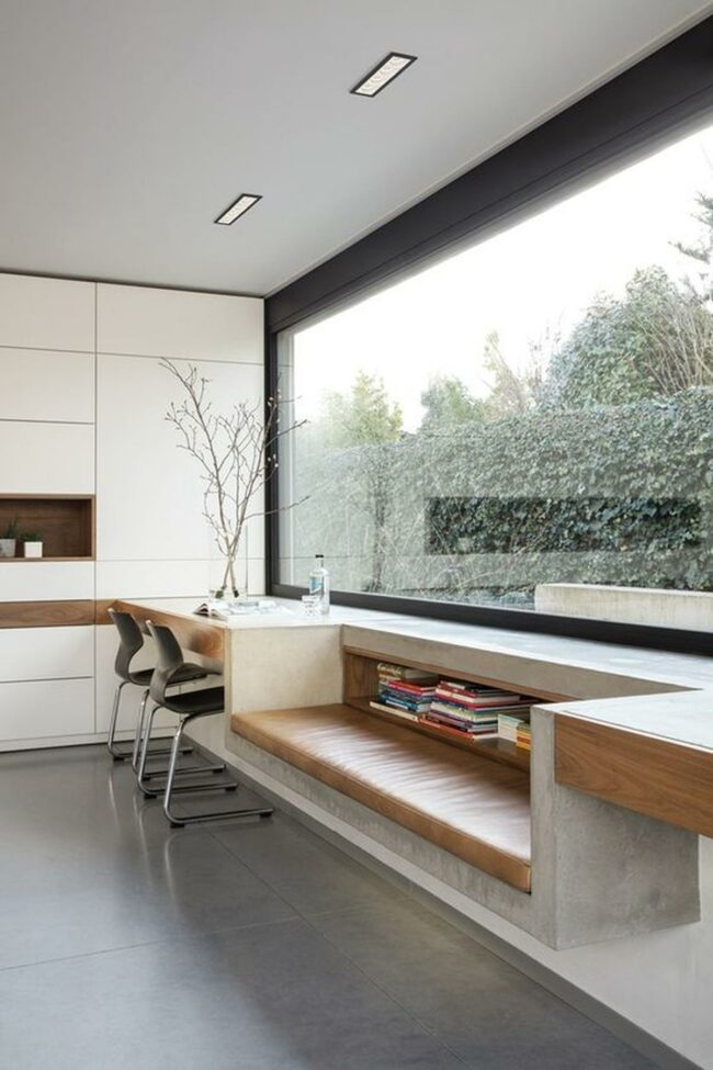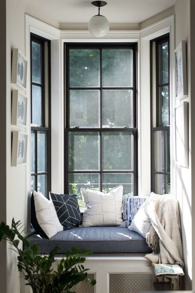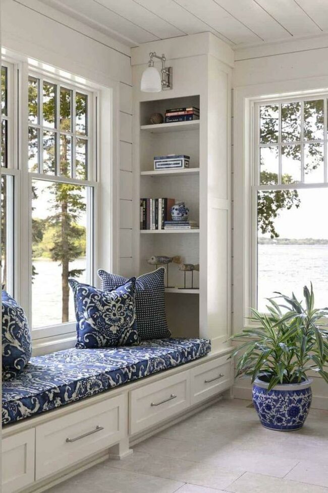 Daylight pours through the window seat with its crisp white surfaces, creating a perfect spot for morning coffee or afternoon reading.