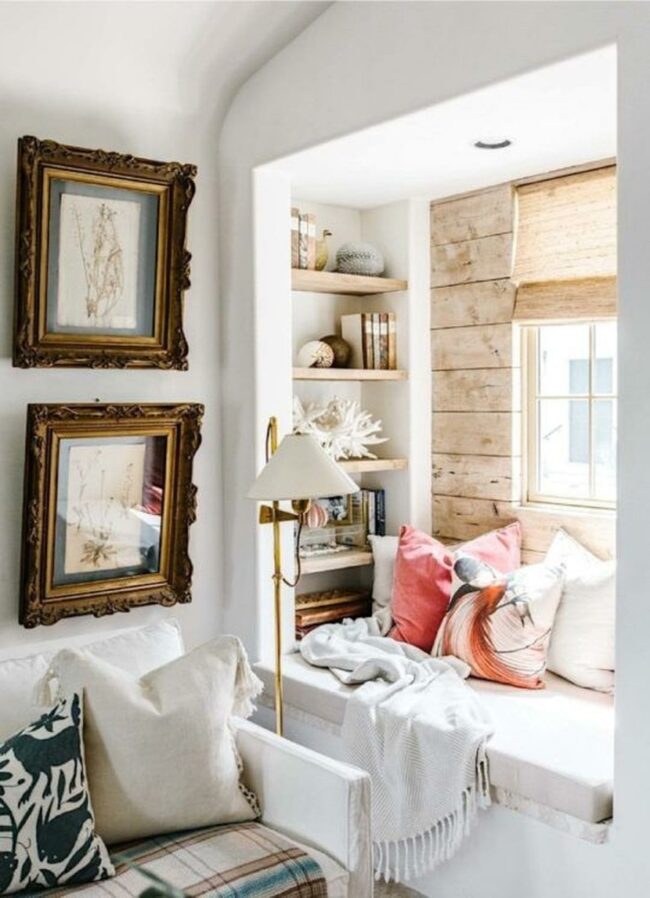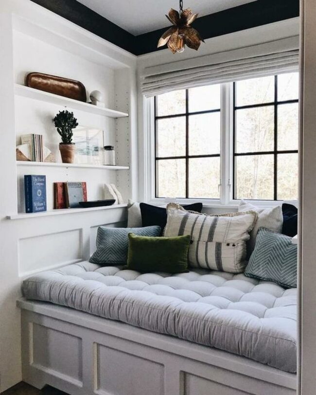 Simple color choices throughout the nook create a calm atmosphere that helps the mind relax and focus on reading.