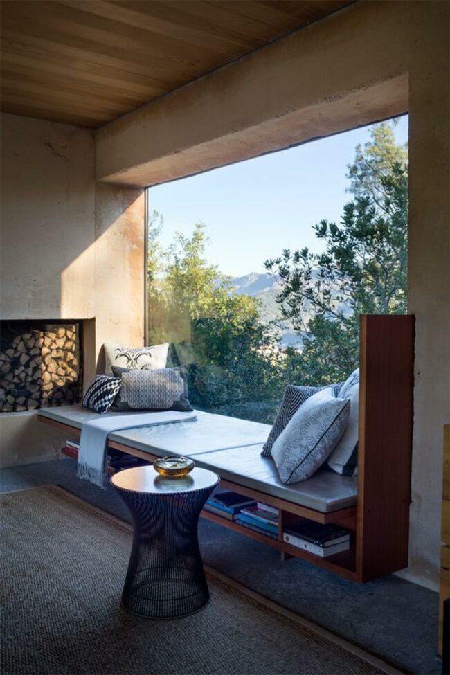 Patterned cushions line the built-in bench, offering a perfect spot to relax with a book or morning coffee.