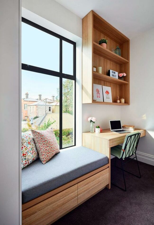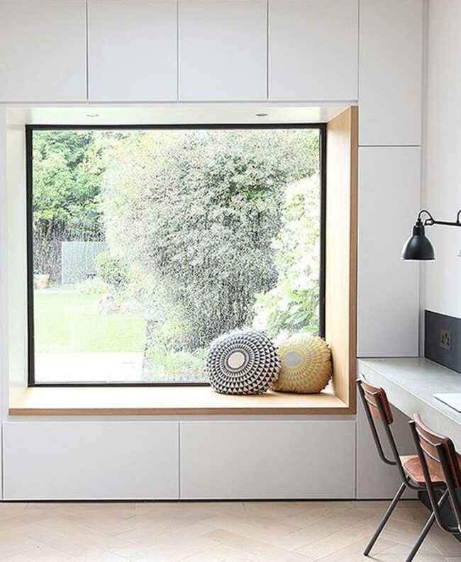 Sunlight streams through the large window onto the built-in bench below, enhanced by a cheerful yellow cushion that instantly lifts the mood.