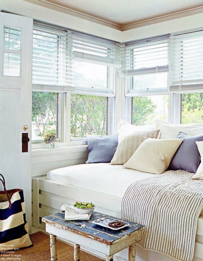 The white daybed, adorned with comfortable pillows in calming blues, creams, and beiges, offers a perfect spot for reading or napping throughout the day.