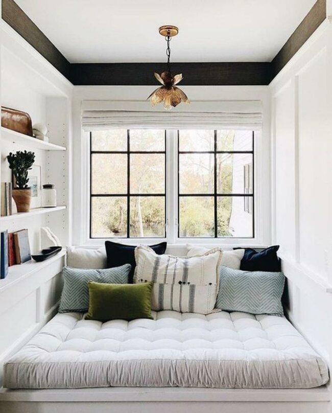 Small details like the varied patterns on pillows add personality without overwhelming the simplicity of this perfect reading spot.