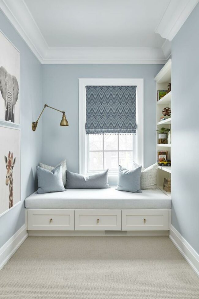 Reading by the window becomes magical in this peaceful light blue nook where sunshine dances through patterned Roman shades onto the inviting cushioned bench below.