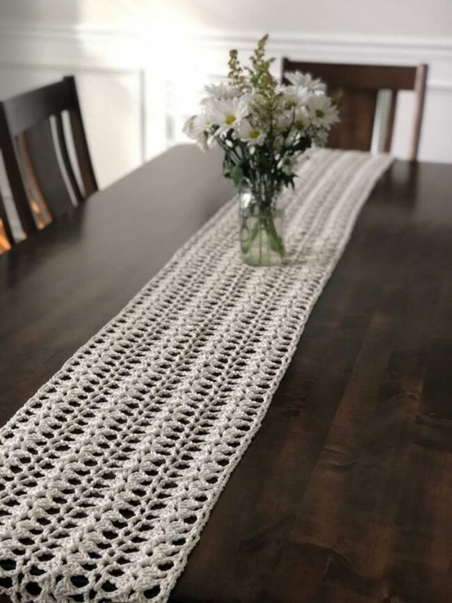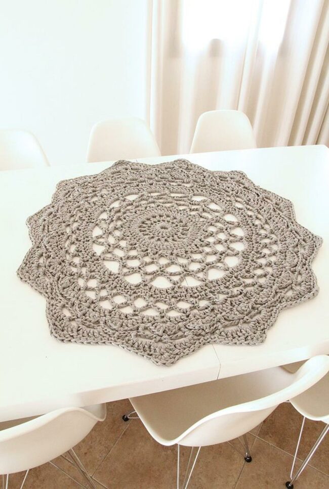 Modern chairs surround the clean white table, while a round hand-crocheted centerpiece in neutral gray adds charm and texture to this inviting dining area.