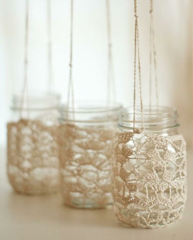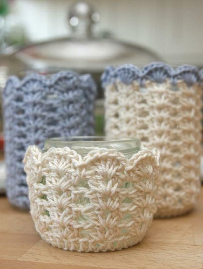 Mason jars adorned with handmade cream and light blue crocheted covers create a peaceful vibe on the rustic wooden surface.