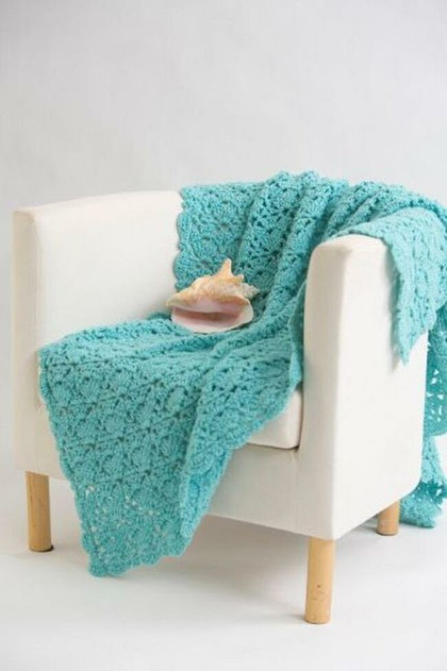 Delicate seashells placed nearby create a perfect balance between handmade comfort and natural elements that many people love in home decor.