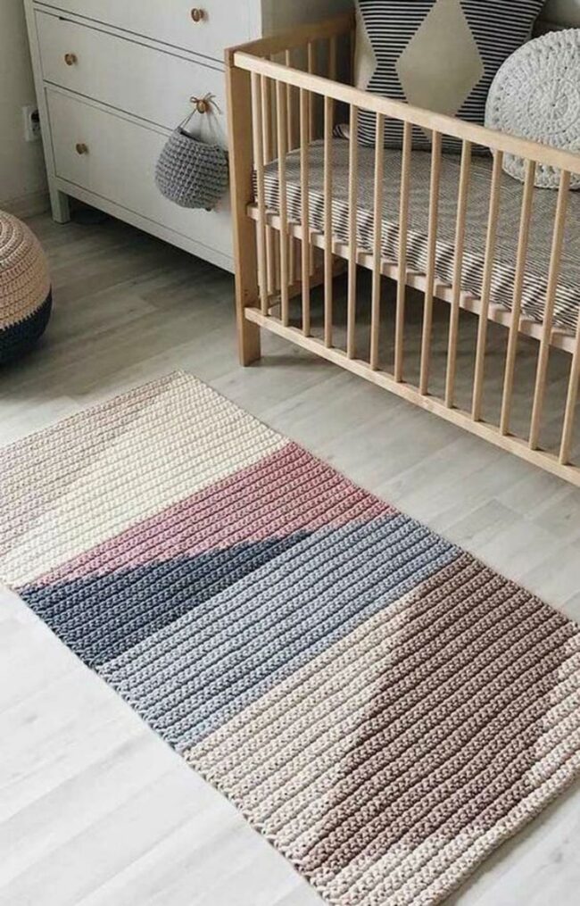 My favorite touch is the colorful crochet rug in cream, pink, blue, and brown that adds personality without overwhelming the senses.