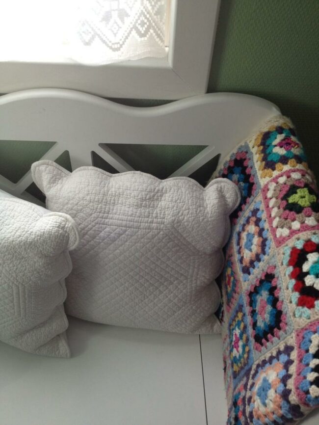 The handmade crochet blanket draped over one side adds squares of blue, pink, red, and cream patterns for a splash of color in this charming corner.