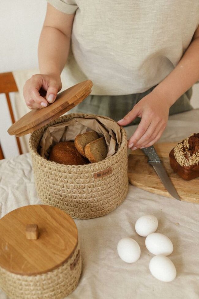 Country kitchens come alive with warm tones and natural textures from woven baskets and wooden lids that create instant charm.