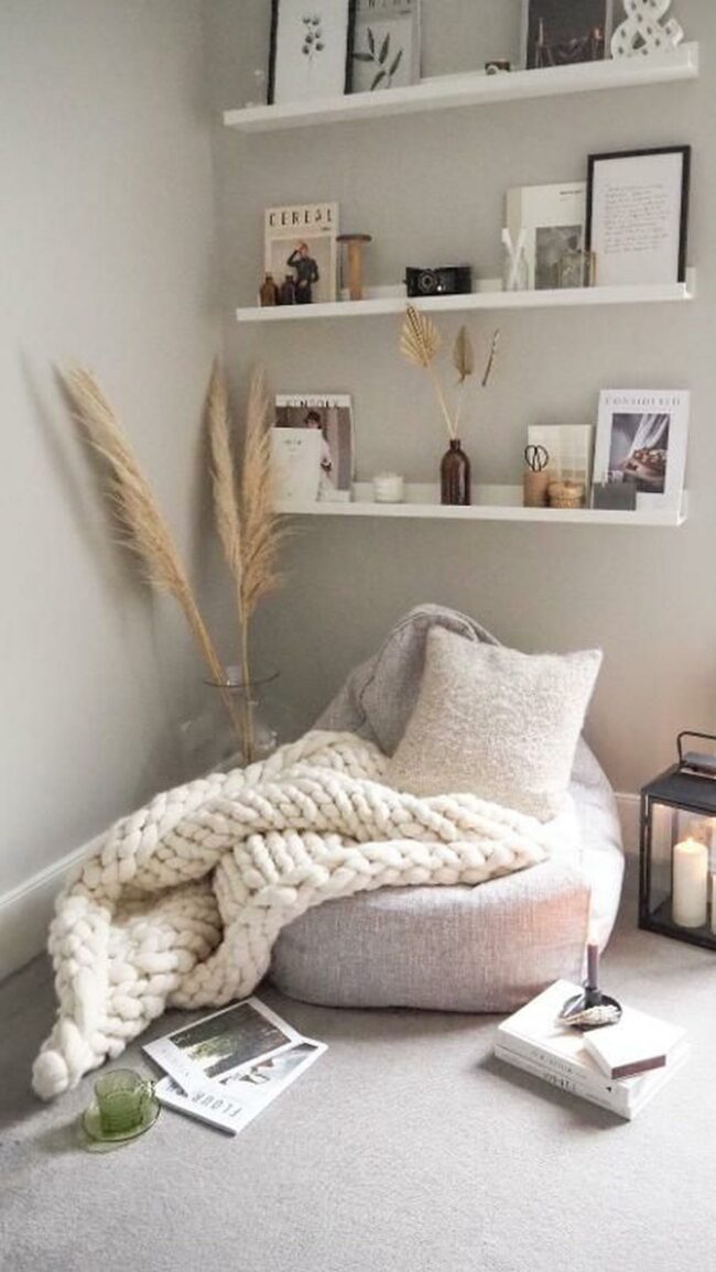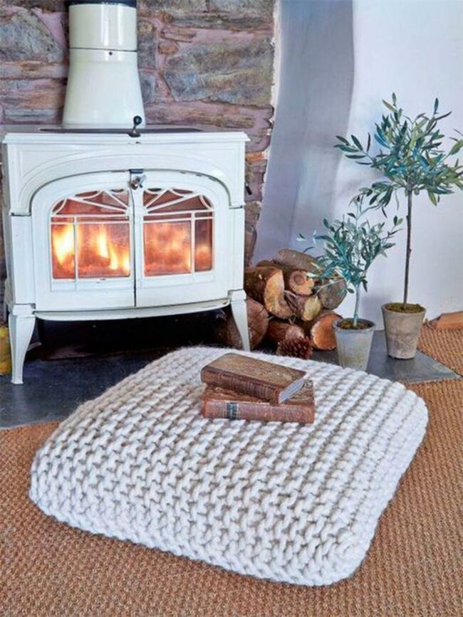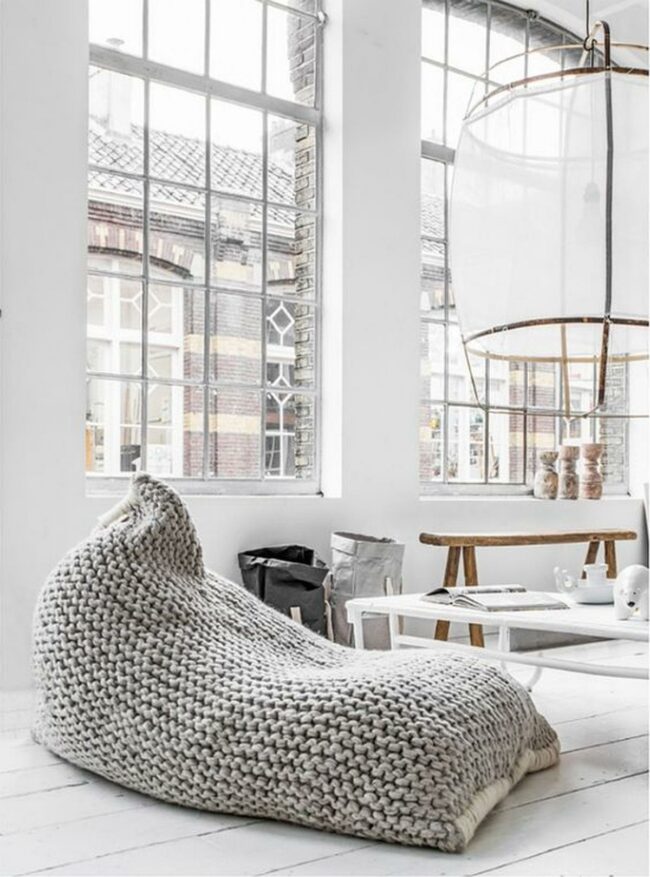 The chunky knit bean bag stands out as a perfect spot for lounging, its thick texture adding warmth to the minimalist setting.