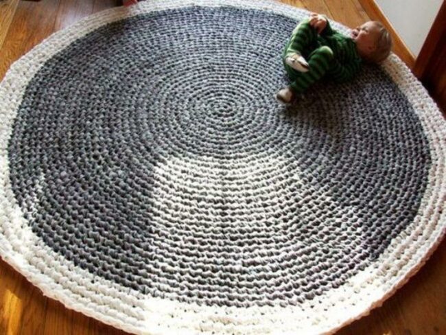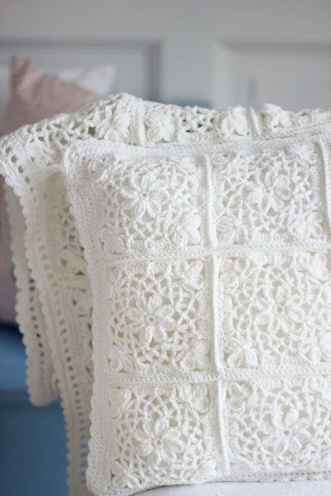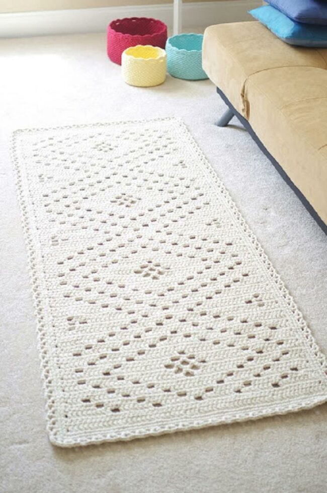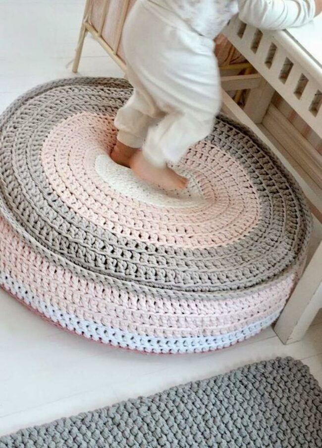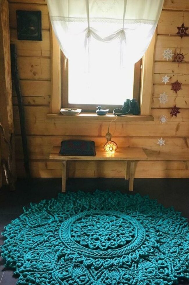 Cream-colored crochet rugs display intricate patterns while adding texture to the overall design.