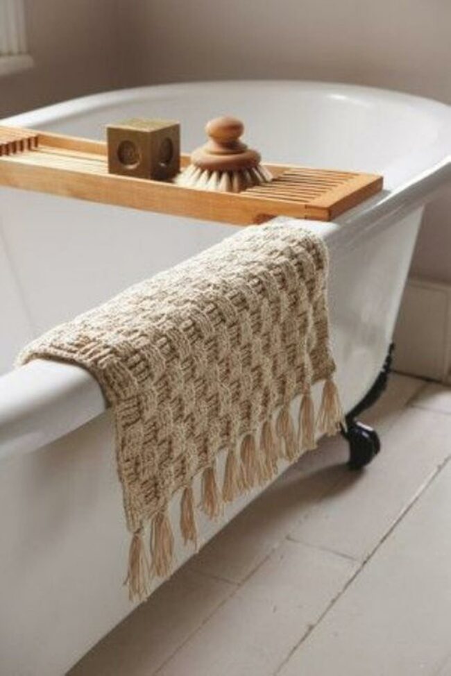 Beige knitted towels with delicate tassels hang gracefully over the edge, bringing warmth and texture to the cool porcelain surface.