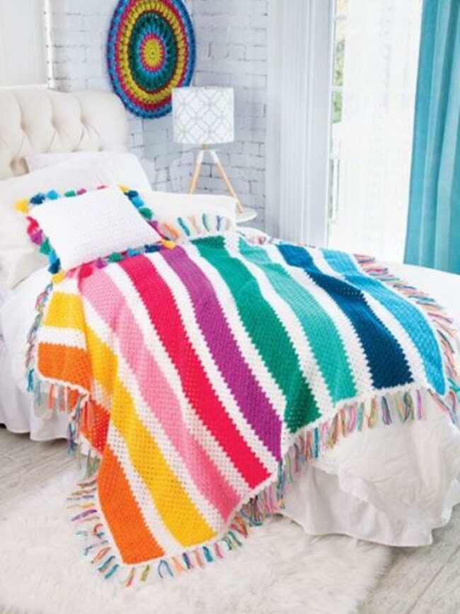 Playful tassels in coordinating hues dangle from the edges, adding whimsical charm to the handcrafted design.