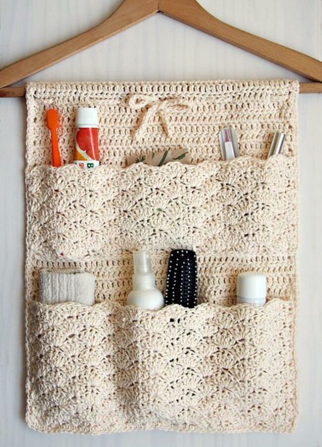 Crafted from cream-colored yarn with an elegant crochet pattern, this hanging organizer features six convenient pockets that neatly store bathroom essentials such as toothbrushes, toothpaste, and small bottles.