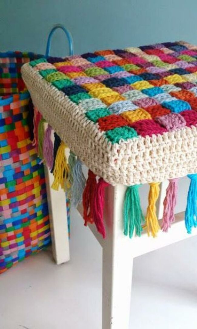 Dazzling multicolored crochet adorns this eye-catching furniture piece with its lively checkerboard pattern squares that instantly grab attention.