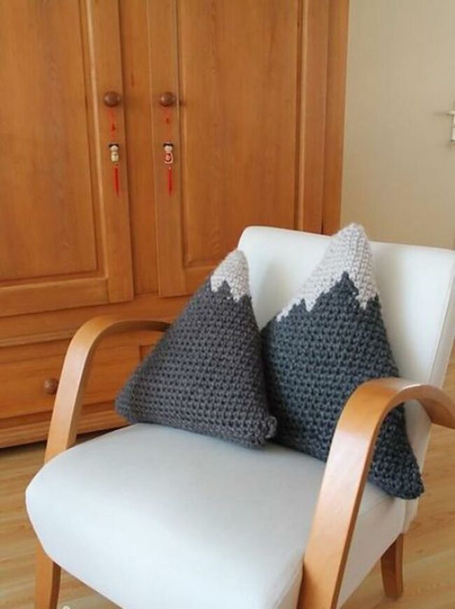Two mountain-shaped pillows in dark gray and white patterns rest against the chair, adding whimsical personality to the seating area.