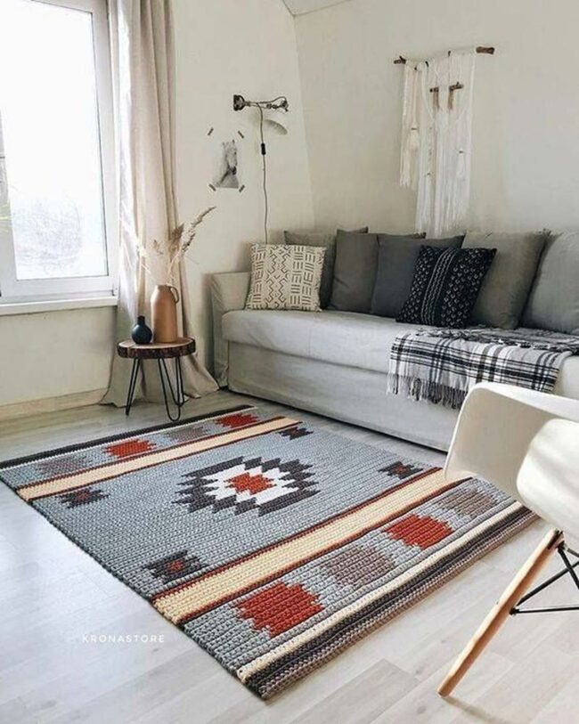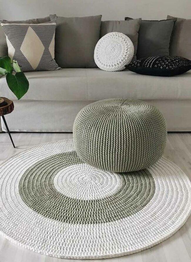 Handcrafted hexagon crochet rug in earthy greens, beige, white, and browns adds texture and character to the space.