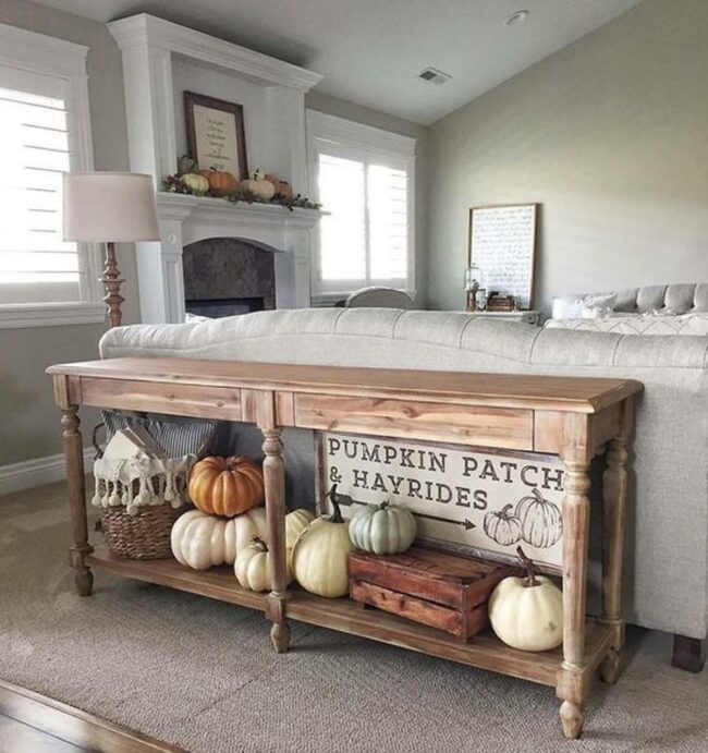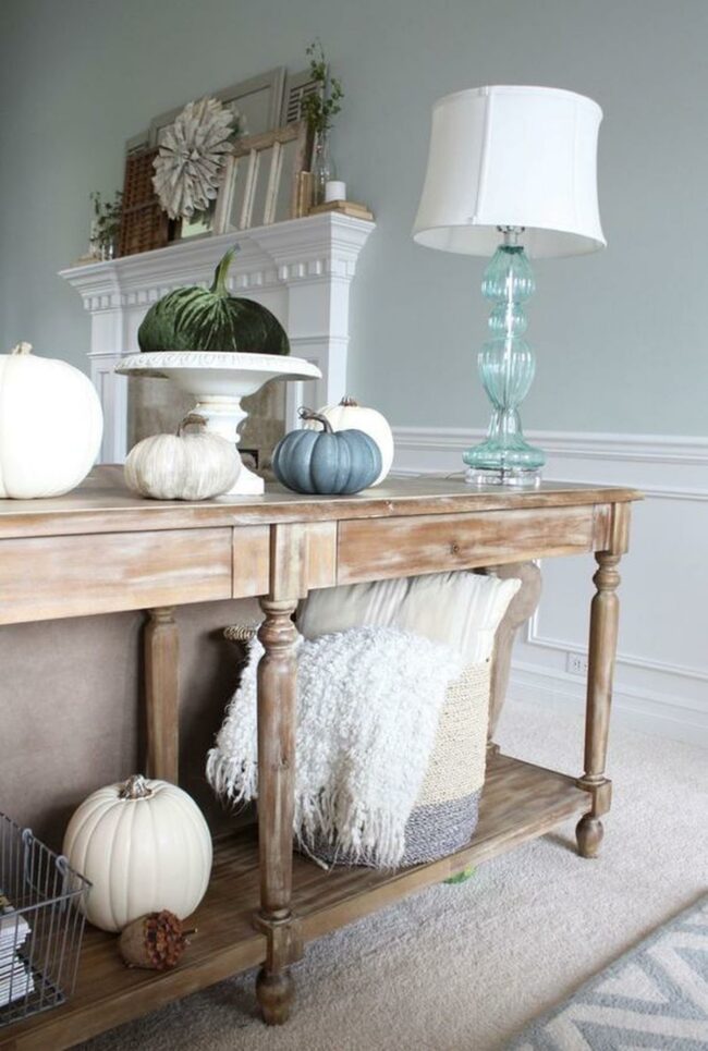Orange and white pumpkins strategically placed on the tabletop and lower shelf bring vibrant seasonal spirit.