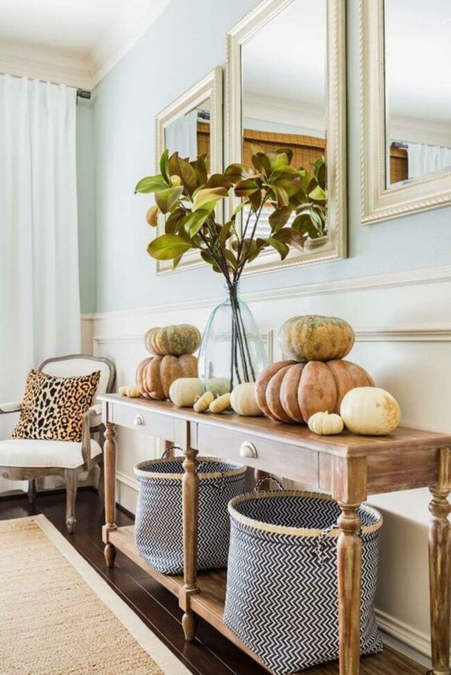 Small pumpkins and green accents bring outdoor beauty inside the room.