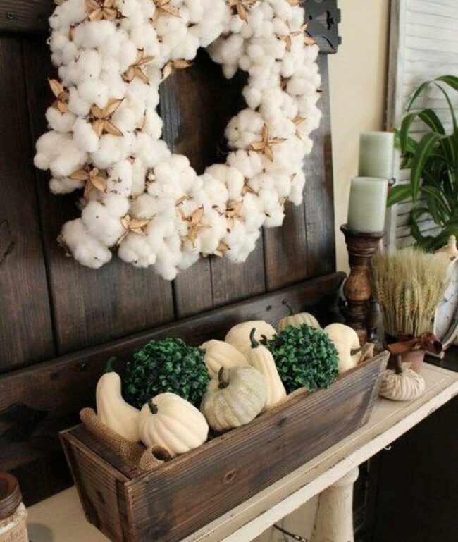 Cotton wreaths add soft texture against wooden backgrounds, creating visual interest.