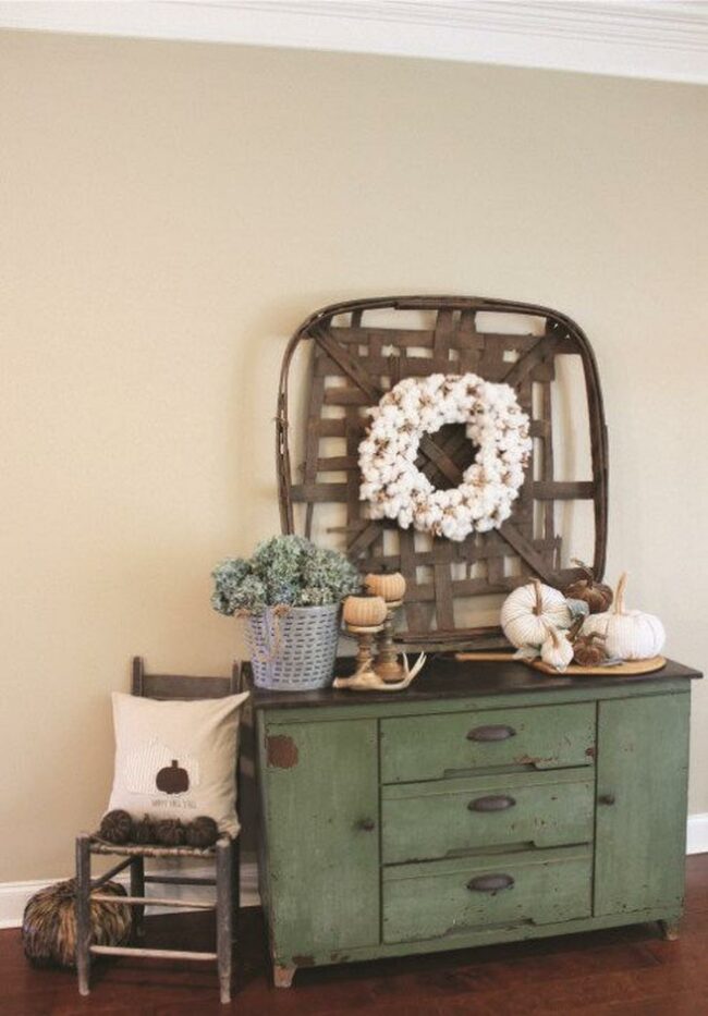 Rustic autumn decor showcases a charming green wooden cabinet that captures the season's essence.